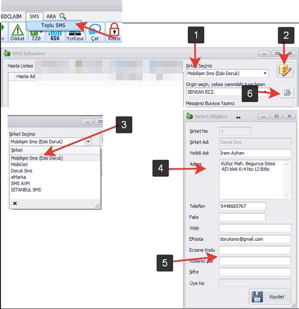 SMS ayarlarını yapmak için "SMS" Menüsünden "Toplu SMS" seçilir. Şirketlerle anlaşma yapıldıktan sonra üyelik Kullanıcı Adı ve Şifresi girilerek Kaydet tuşuna tıklanır. Üyeliğin tamamlandığını görmek ve SMS göndermeye başlamak için SMS başlığını çağırmanız gerekli bunun için "ORJIN" tuşuna basınız.( Res No:6 ) Başa Dön