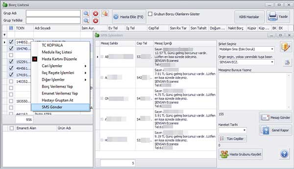 • Raporlu ilaçlarının Günü Gelmiş Hastalara SMS göndermek için öncelikle Günü Gelmiş Raporlu İlaçlar Listesi açılır ve ilgili hastalar işaretlenir. Sonra Sağ klik ile açılan menüden SMS Gönder tıklanır.