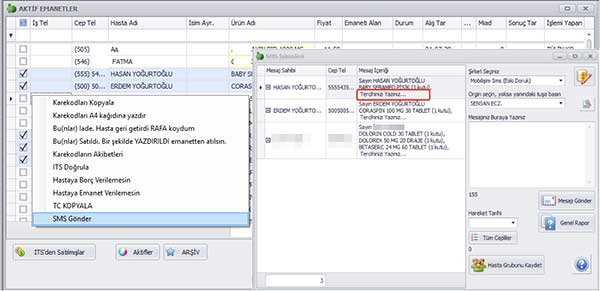 • SMS gönderilecek ve telefonu kayıtlı hastaların emanet satırları işaretlenir.