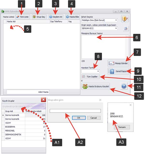 2. Grup Seç : Daha önce oluşturulmuş Hasta Grubunu çağırır (Res No: A1). Listeye çift tıklayarak grup içindeki hastalar çağırılır ve Mesaj yazılarak gönderilir.